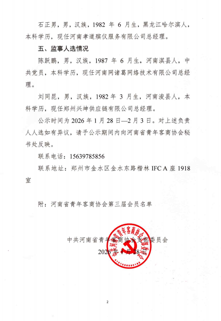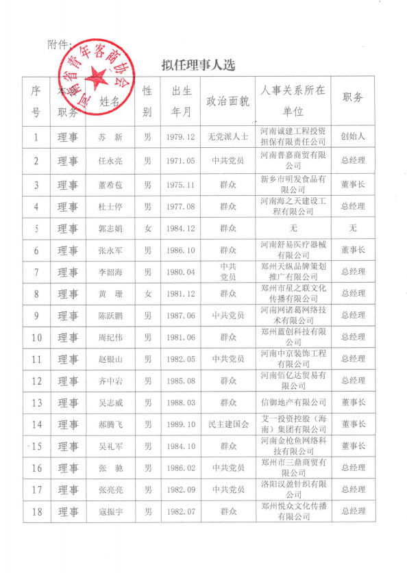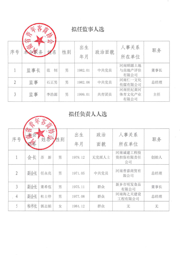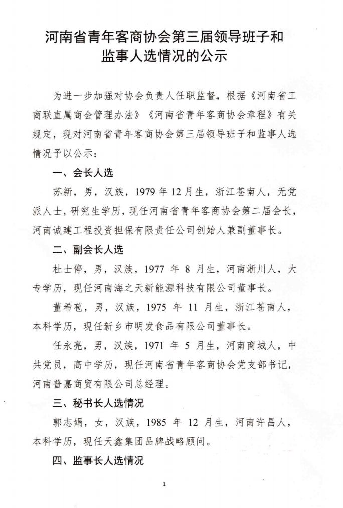 【摘要】为进一步加强协会组织建设,凝聚青年客商力量,根据《河南省青年客商协会章程》及相关管理规定,现将新一届理事会、监事会及负责人拟任名单予以公示。具体内容如下: