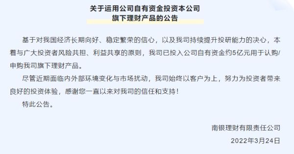 南银理财表示,此次自购基于对我国经济长期向好、稳定繁荣的信心。