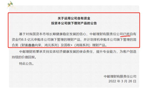 中邮理财称,已将自有资金约6.5亿元申购公司旗下管理的理财产品,并计划择机申购本公司旗下管理的混合类(财富鑫鑫向荣、鸿元系列)及固收+(鸿锦系列)理财产品。